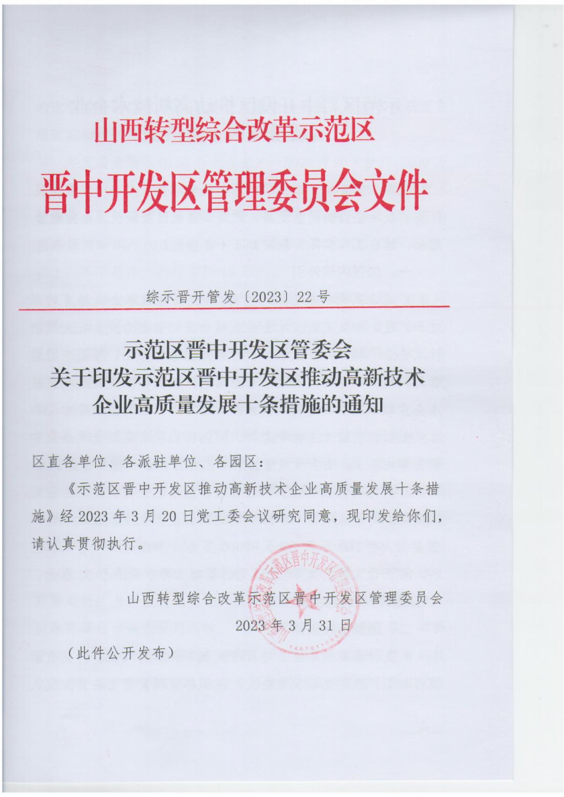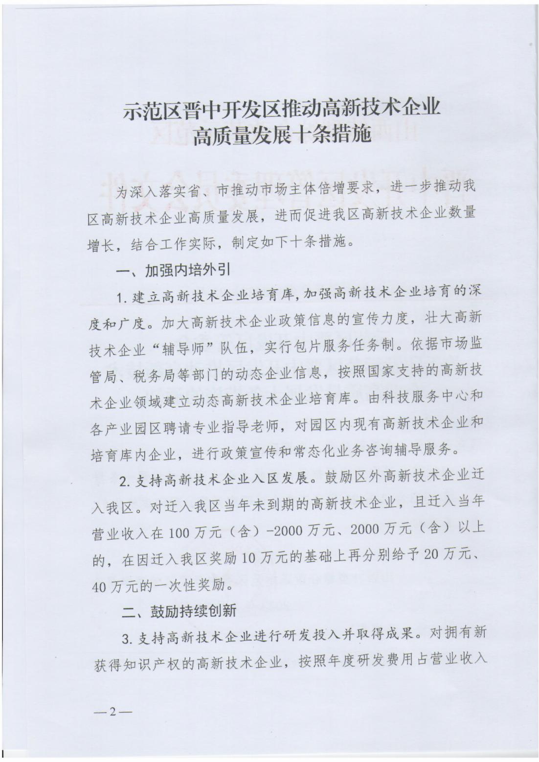 關(guān)于印發(fā)示范區(qū)晉中開發(fā)區(qū)推動高新技術(shù)企業(yè)高質(zhì)量發(fā)展十條措施的通知